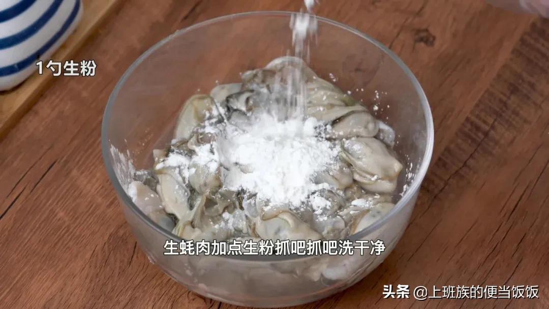 處理好的生蠔肉加1勺生粉抓吧抓吧,洗干凈。