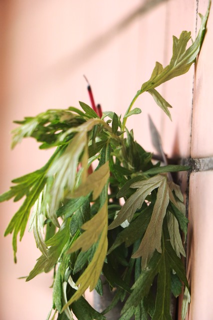 掛艾葉:也叫掛艾草,是中國古代的一種習俗,意在避邪、驅瘟、驅邪、保平安,往年時刻男女老少都要掛艾葉。
