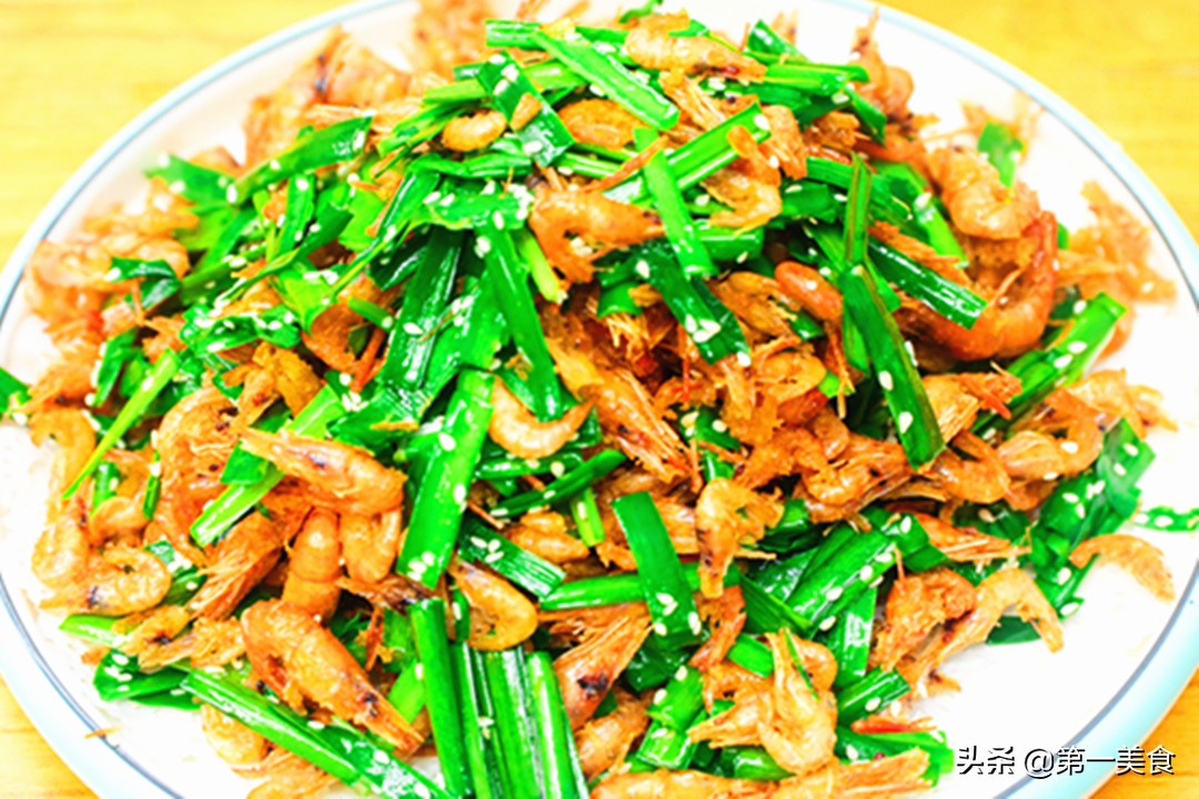 6.鍋里留底油,放入韭菜段,加入食鹽、雞粉,大火快速翻炒至斷生,然后倒入炸好的河蝦繼續翻勻,出鍋前撒上白芝麻、美味即成。
