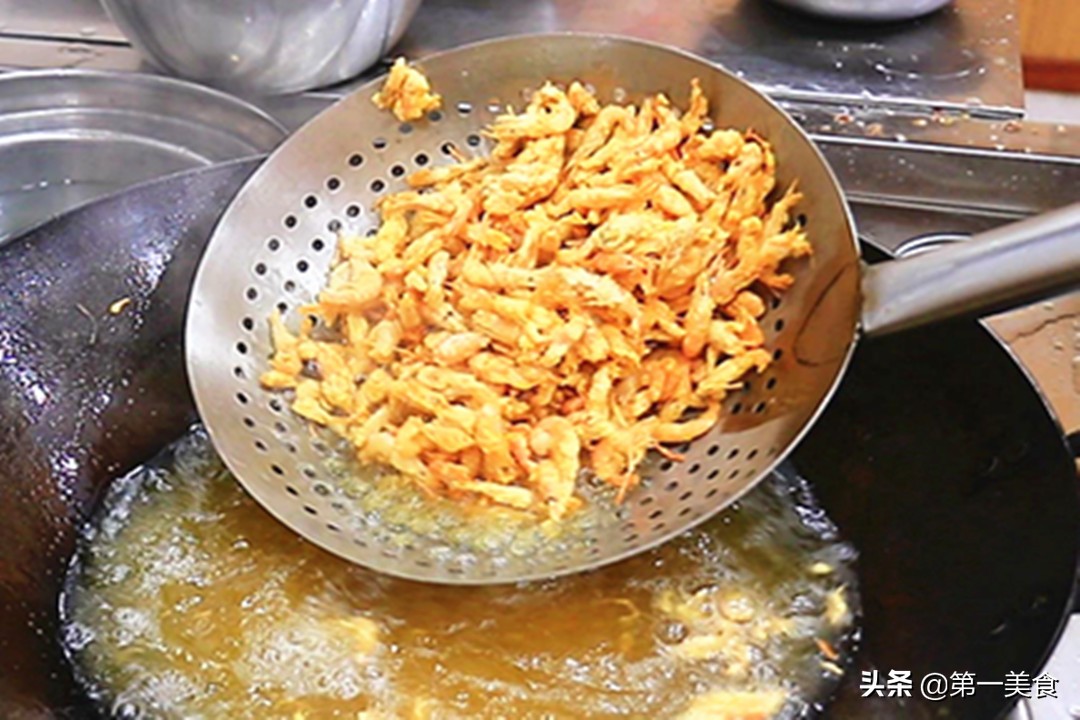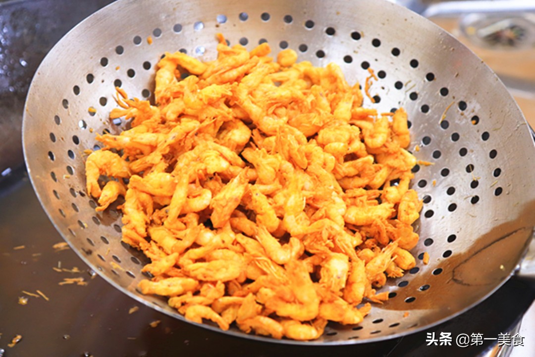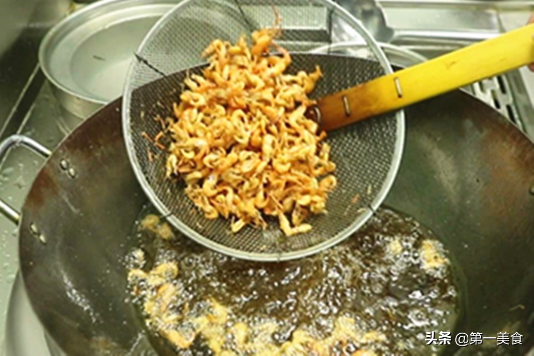 5.然后升高油溫至五成熱,放入河蝦復炸一遍,吐吐油同時把蝦炸酥,一直炸至金黃焦酥撈出來控油。