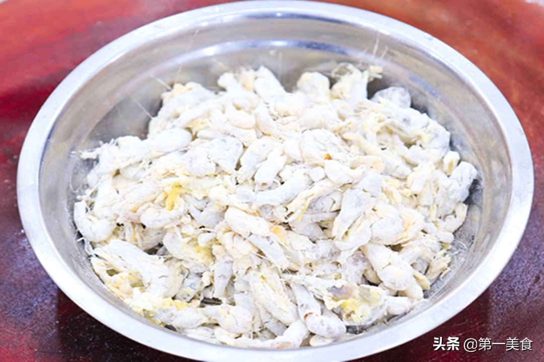 2.10分鐘以后加入少許吉士粉增香起酥,家里沒有的也可以不放,再分次加入適量的面粉拌勻,盡量讓每一只小河蝦都裹上面粉,裹成這樣干燥無水的狀態,這樣炸的時候不會粘連,炸出來更加焦酥。裹好以后我們把小河蝦取出來,抖掉多余的面粉后準備炸制。
