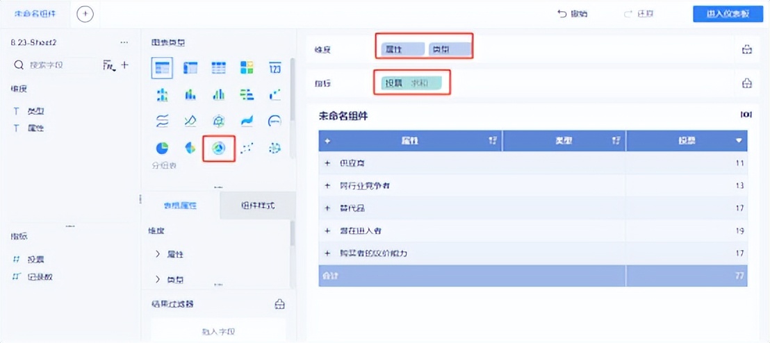 - 導入數據源-將屬性、類型拖入橫軸中,將指得票拖入縱軸中。