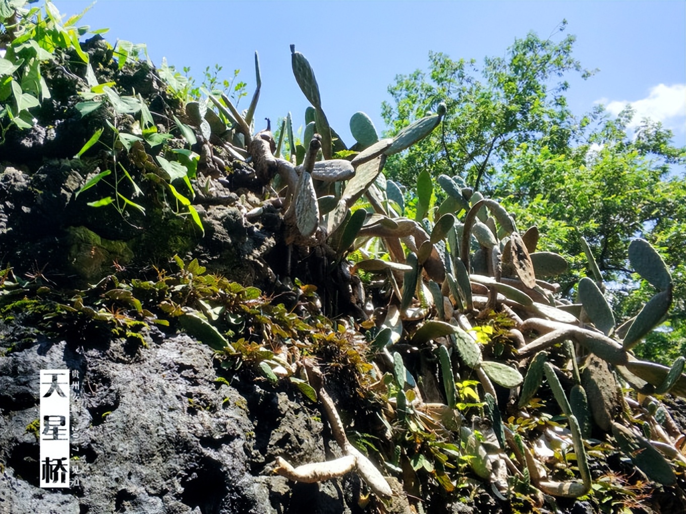 石頭上長了很多仙人掌。