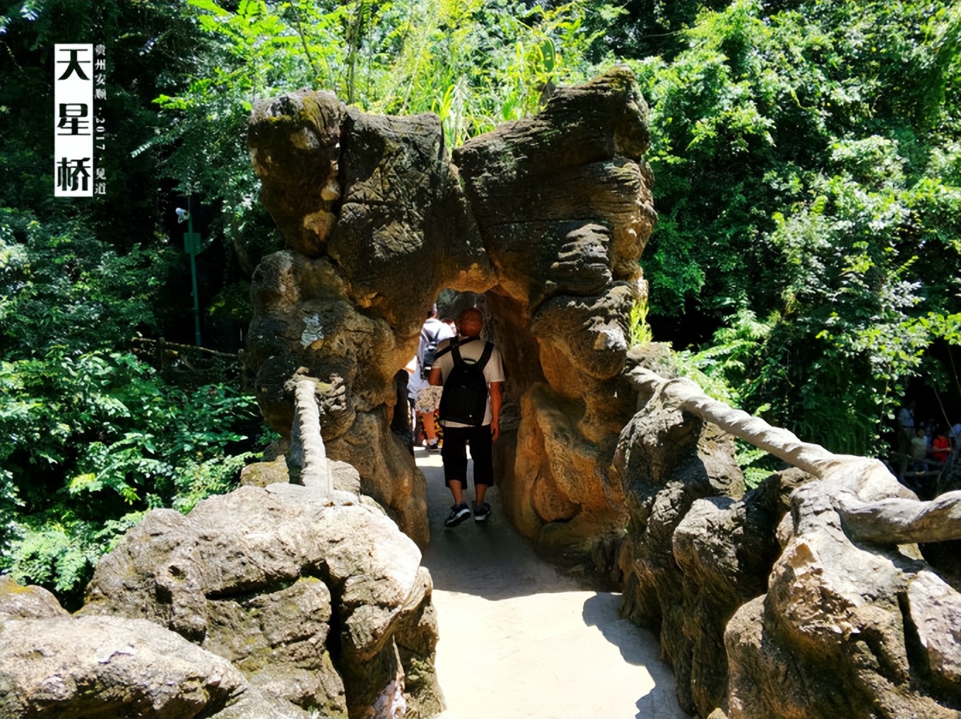 而中間的這塊巨石,還是空心的,從而形成過橋的通道,也就是橋上橋吧。
