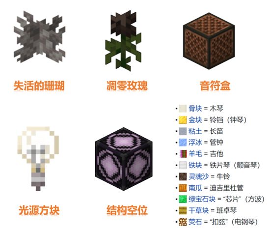 基巖版的更新為大家帶來了眾多新的方塊,光源方塊與凋靈玫瑰讓你的家園增添新的色彩。珊瑚放置在沒有水的地方會變成失活的珊瑚,更加貼近現實生活。而音符盒增添了11中全新的音效,挑戰用紅石演奏一段你喜歡的旋律吧。