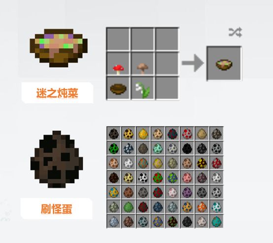向棕色哞菇喂食花朵即可得到有趣的迷之燉菜,食用它就能獲得各種獨特的BUFF。我們還可以在沉船遺跡的補給箱或者與村民交易來獲得燉菜,不知道到底味道如何。而新加入的刷怪蛋中也有可愛的小狐貍哦,還不快去摸摸它柔軟的毛發。