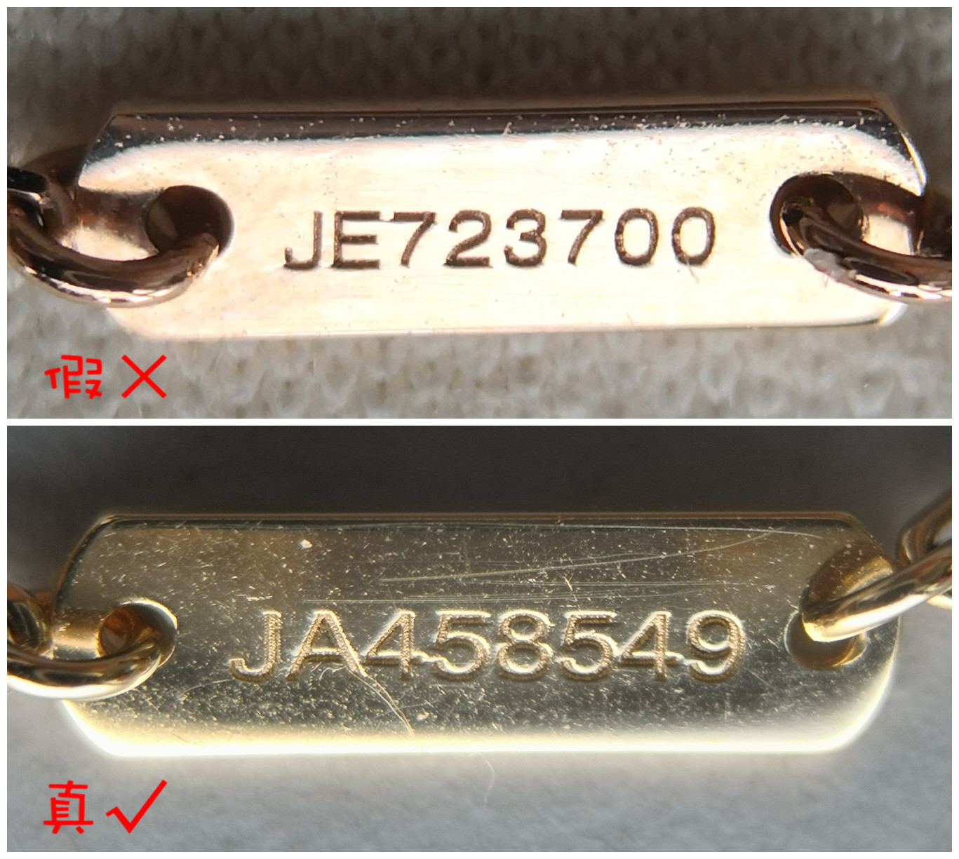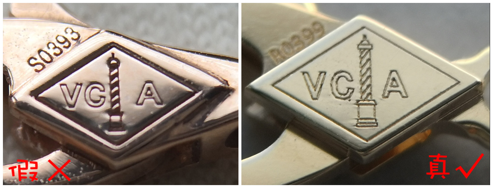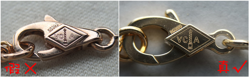仿品項鏈的連接處打磨粗糙,放大看有坑坑洼洼的痕跡,正品項鏈的連接處打磨光滑,有金屬質感。除此之外仿品“VCA”logo刻印深淺不一致,而正品刻印則清晰一致,符合該品牌的制作工藝。