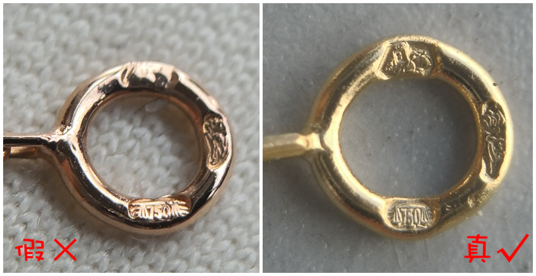 仿品項鏈的扣環處刻印模糊,材質與正品材質差距過大。