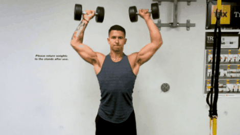 動作標準:雙手各持一只啞鈴,站立,左腳向前邁一步,右腳向后跨一步,然后將啞鈴從肩膀推舉至頭頂,再放回肩膀,重復此動作。