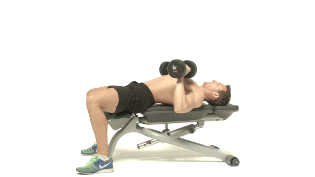 動作標準:躺在臥推臺上,雙手各持一只啞鈴,然后將啞鈴從胸部推至上方,再放回胸部,重復此動作。