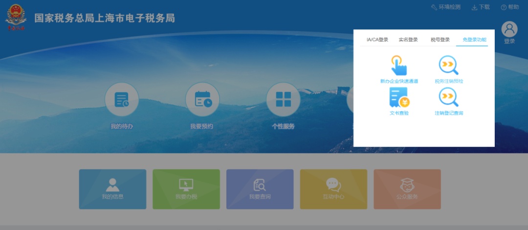 電子稅務局首頁點擊“免登陸功能”選擇“新辦企業快速通道”鏈接進入操作界面。