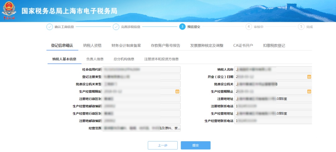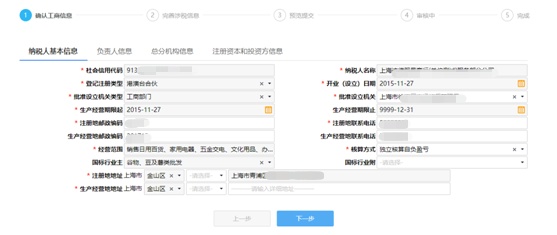 首先確認基礎登記信息。標“*”為必填項,街道鄉鎮根據注冊地址自動匹配帶出,若匹配不出可手工選擇。