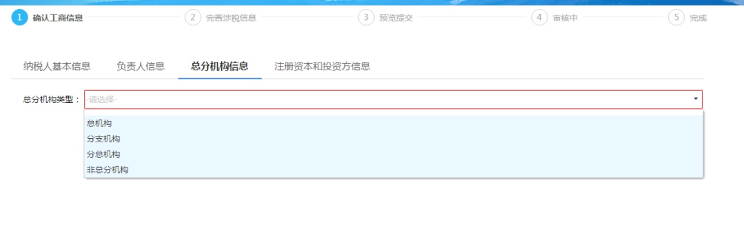 納稅人根據企業實際情況選擇總分機構類型;選擇“總機構”時,需錄入“分支機構”;選擇“分支機構”時,需錄入“總機構”信息;選擇“分總機構”時,需錄入“總機構”以及“分支機構”信息;