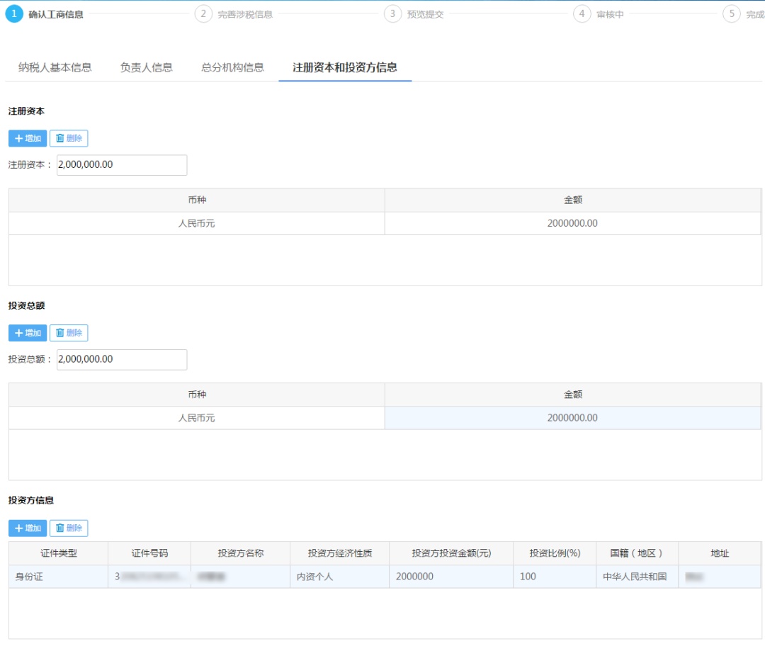 納稅人需錄入“注冊資本”、“投資總額”、“投資方信息”;需要維護投資人的經濟性質,對于中國國籍的投資人還需要填寫其住所地址,投資比例合計必須為100%。