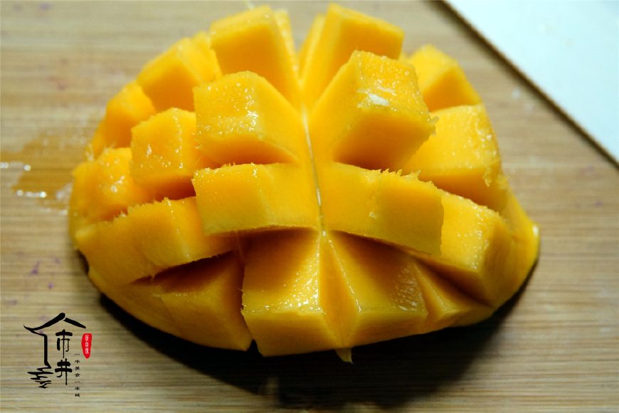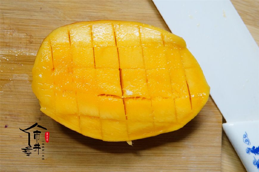 第一步,先處理水果。芒果切塊,這里教大家一個很實用的切芒果小竅門,先把芒果帶皮切成兩半,注意避開中間那個大核,有核的那半可以直接把核切掉。剩下這兩半交叉切成塊狀,就是橫著來幾刀,然后豎著再來幾刀,注意底下的果皮不能切斷。