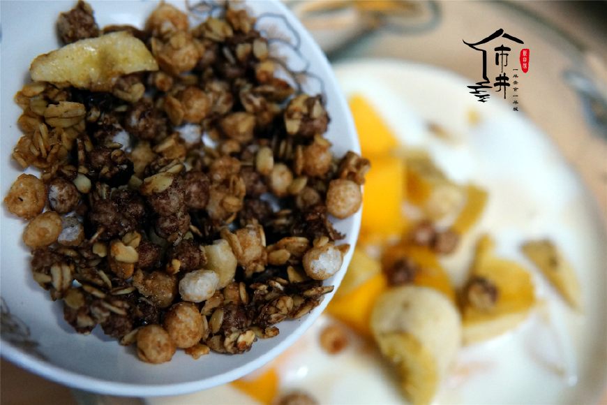 第三步,買來的谷粒多均勻地撒在水果酸奶上。我用的是巧克力谷粒多,里面還帶有香蕉干。這是孩子愛吃的一款。其實我自己喜歡吃蔓越莓的,超市里品種多樣,大家可以挑選自己喜歡的。谷粒多既能裝飾酸奶,還能沖泡和干吃,孩子的最愛。