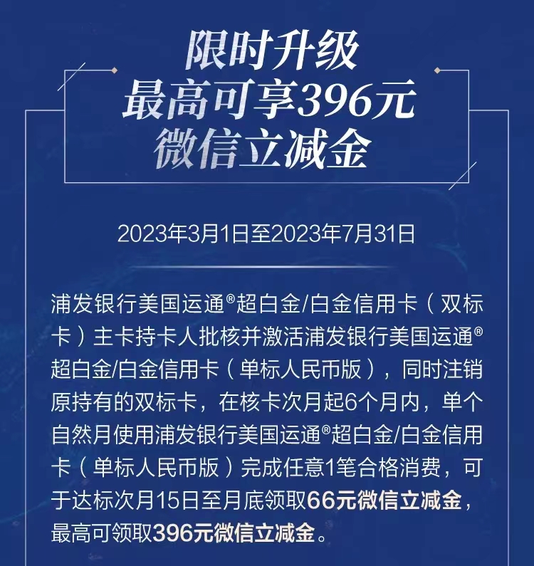 為了吸引原卡用戶換卡,浦發銀行與美國運通還為換卡提供了升級獎勵,2023年3月1日至2023年7月31日,“浦發AE白”、“浦發AE超白”雙卡的主卡持卡人批核并激活單標人民幣卡,同時注銷原有雙標卡,并在核卡次月起6個月內,單自然月使用雙卡完成任意一筆合格消費,即可于達標次月領取66元微信立減金,最高為396元。當然,如果對原卡仍然“心有千千結”的話,在有效期內仍然可以繼續使用。