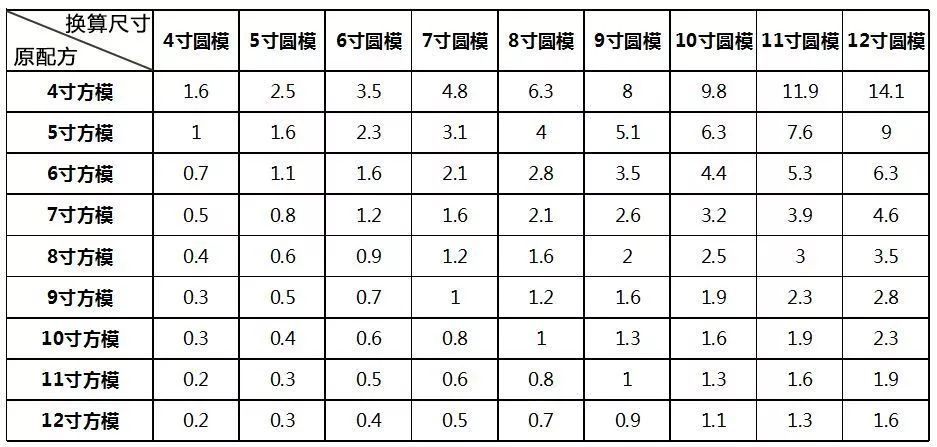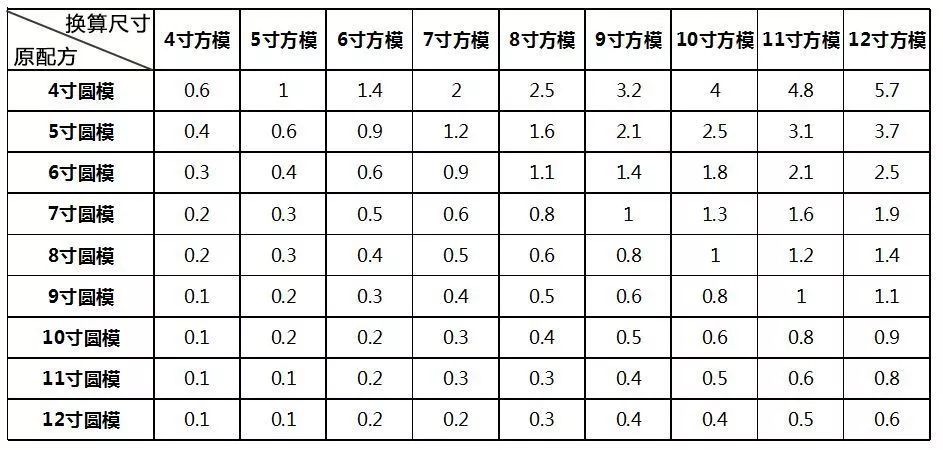 盡管算法很簡單,但每次算完都要和配方量相乘再取個整數,想想還是很麻煩,所以我們就把常見尺寸的換算結果統一整理到一個表格來。