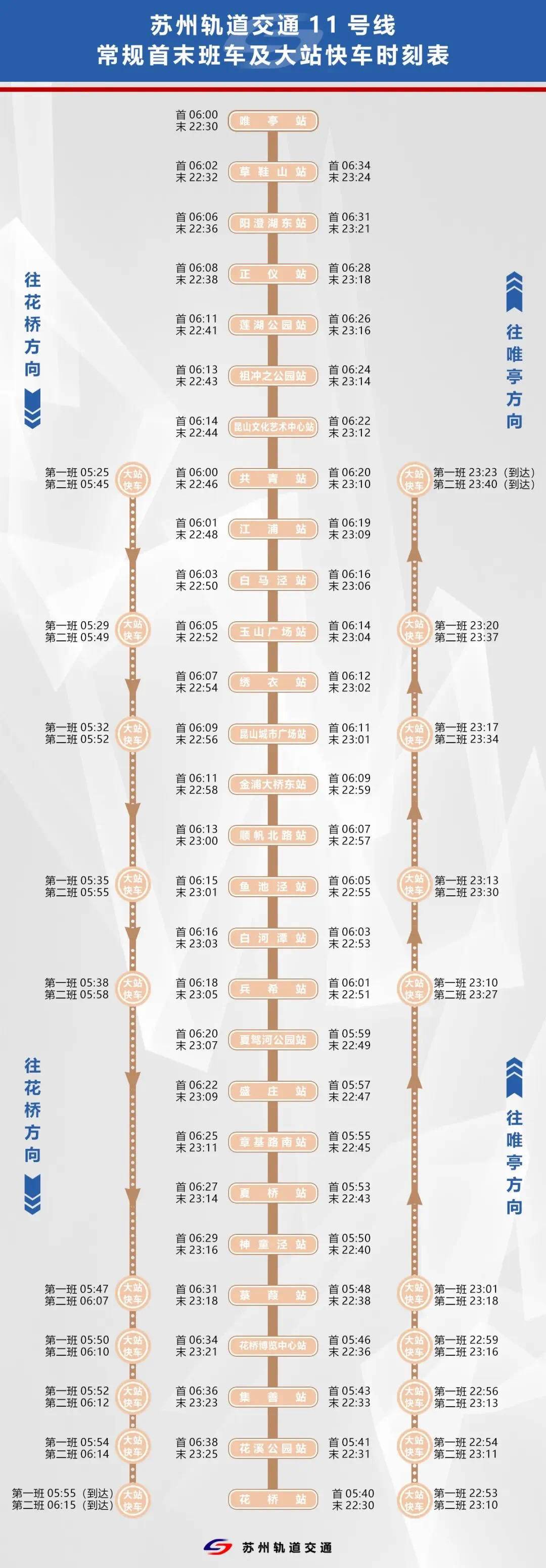 蘇州軌道交通11號線將首次開行首末班大站快車,早間往花橋方向快車在共青站發點分別為5:25和5:45;夜間往唯亭方向快車在花橋站發點分別為22:53和23:10,大站快車沿途停靠:花橋站、花溪公園站、集善站、花橋博覽中心站、菉葭站、兵希站、魚池涇站、昆山城市廣場站、玉山廣場站、共青站共10個站。