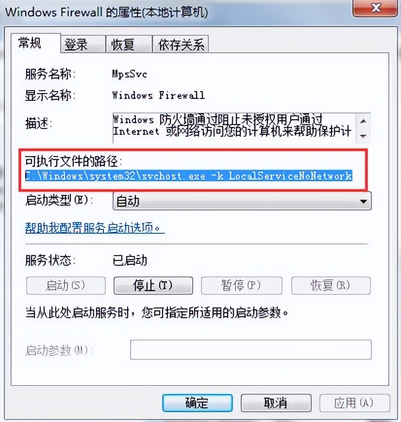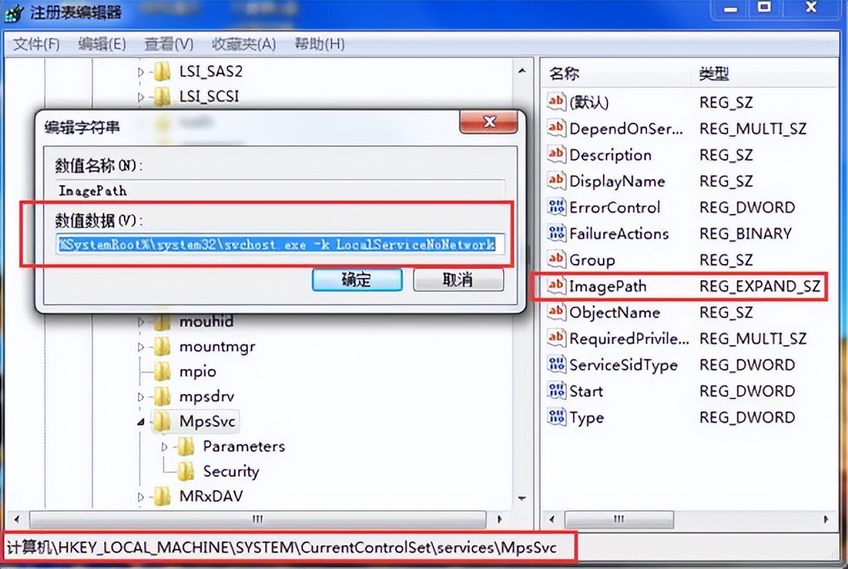 4、依次展開到HKEY_LOCAL_MACHINESYSTEMCurrentControlSetservicesMpsSvc,找到并打開ImagePath,查看里面的數值數據是否一樣C:Windowssystem32svchost.exe -k LocalServiceNoNetwork,如圖所示: