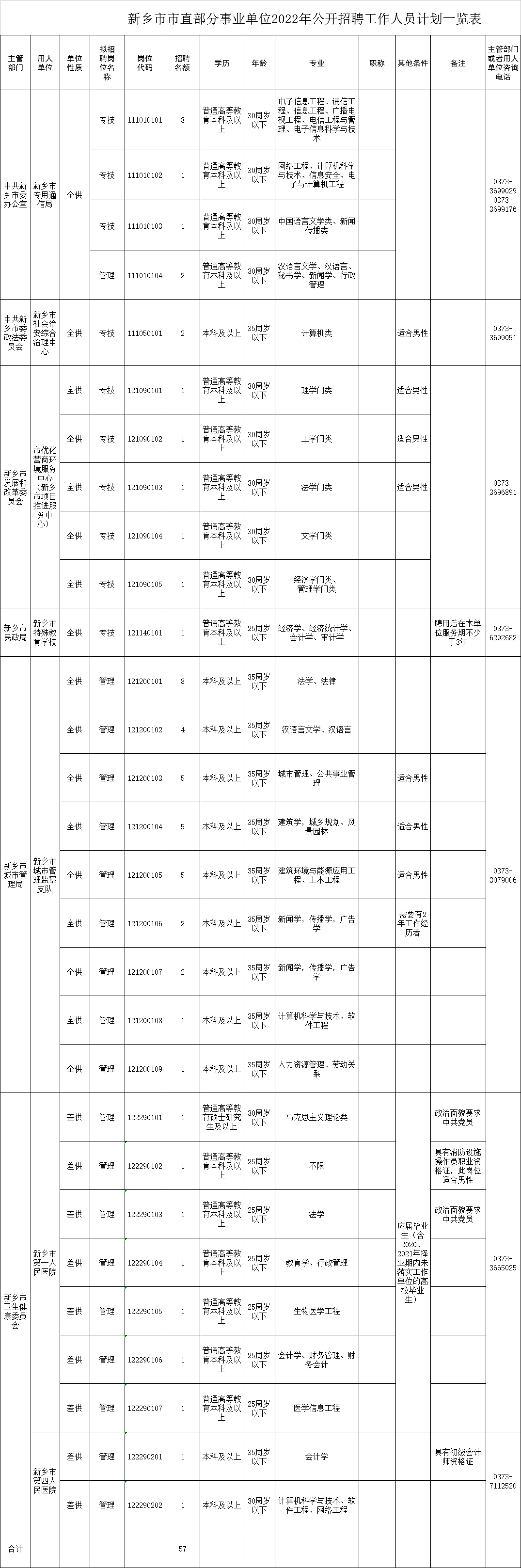 本次市直部分事業單位共計劃招聘57人,具體招聘計劃及相關內容見附件1:《新鄉市市直部分事業單位2022年公開招聘工作人員計劃一覽表》。