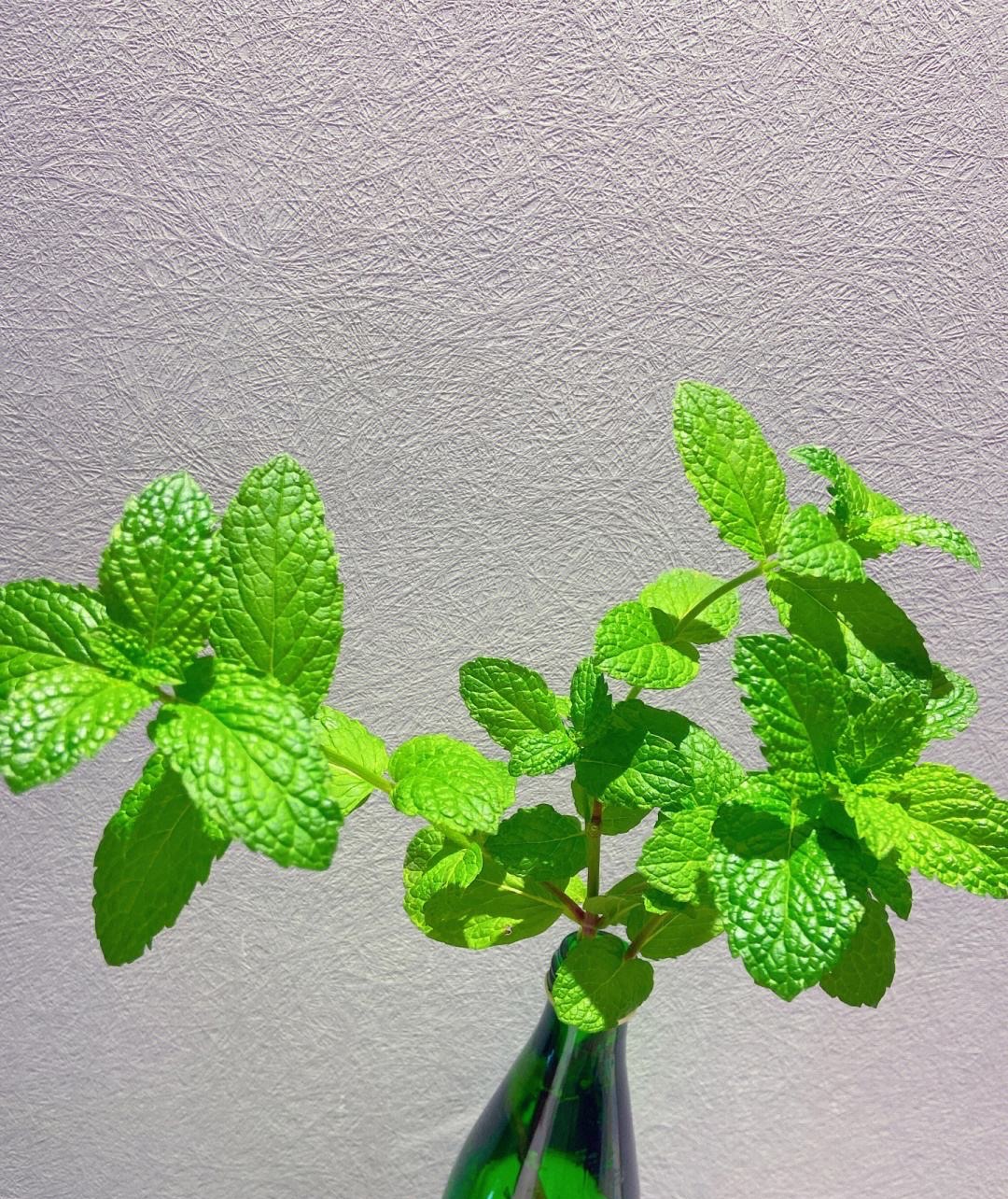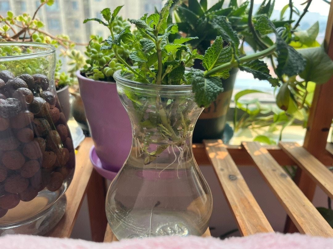 薄荷水培起來也是非常漂亮的,我們可以用一個比較有味道的這個花瓶來水培,薄荷枝葉呢,最好是放多一些,這樣子看起來非常的旺盛美觀,而且非常有味道。