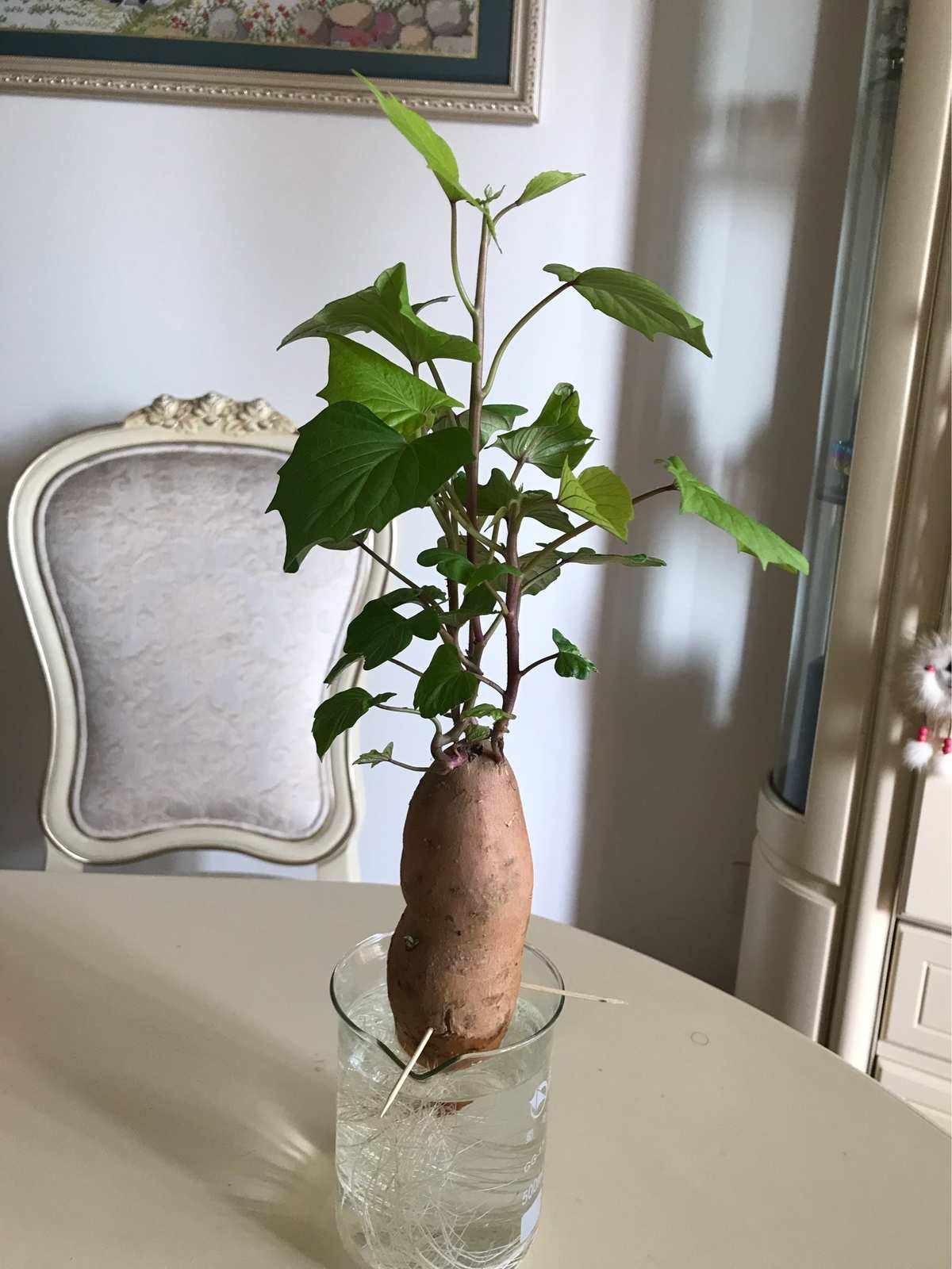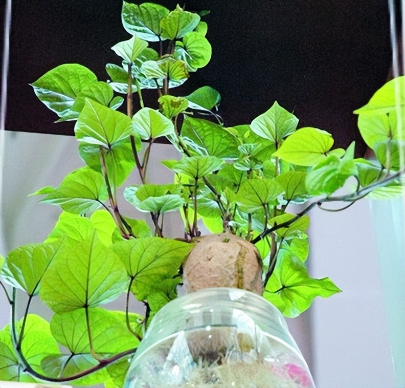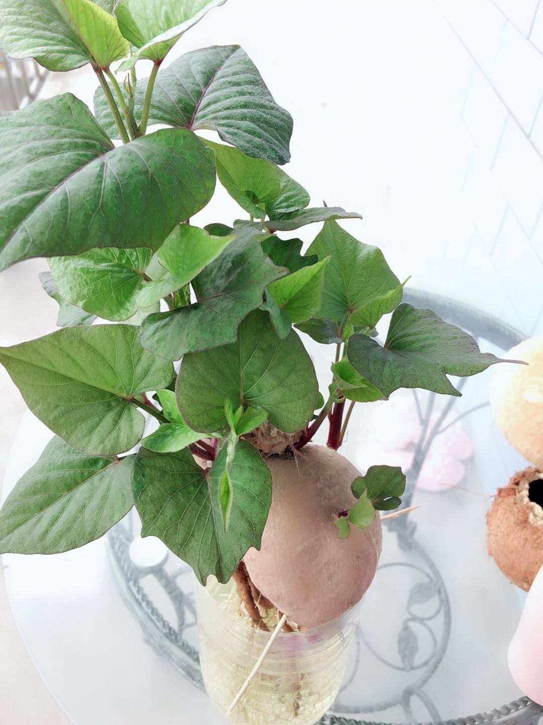 第三種可以水培的植物呢,就是地瓜葉,那么首先呢,不要小看這一種綠植,其實它水培起來也可以從丑小鴨變成白天鵝。