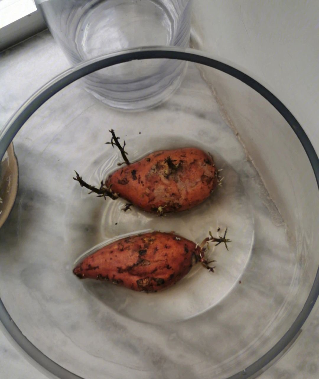 水培方法也非常的簡單,只要溫度不是特別低的話呢,隨時可以水培地瓜葉出來,只需要準備一個發芽的地瓜放在水里面。