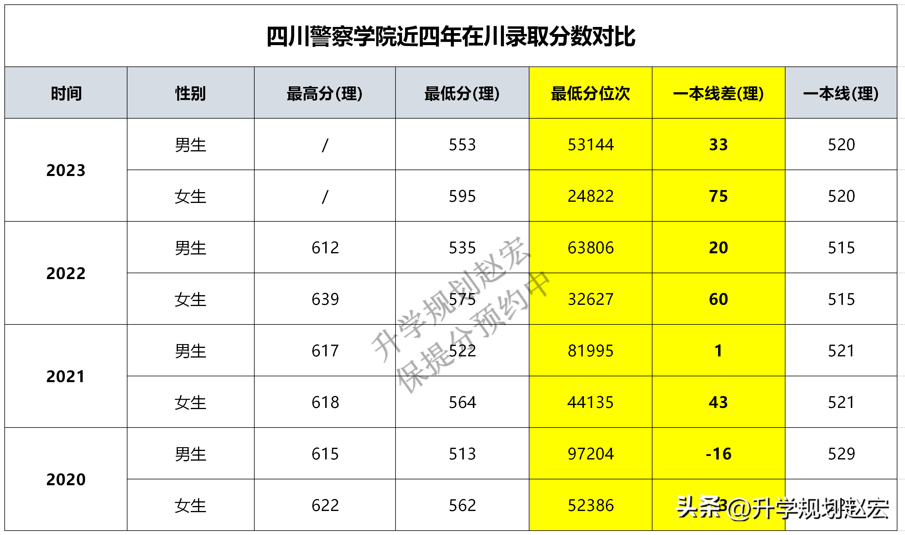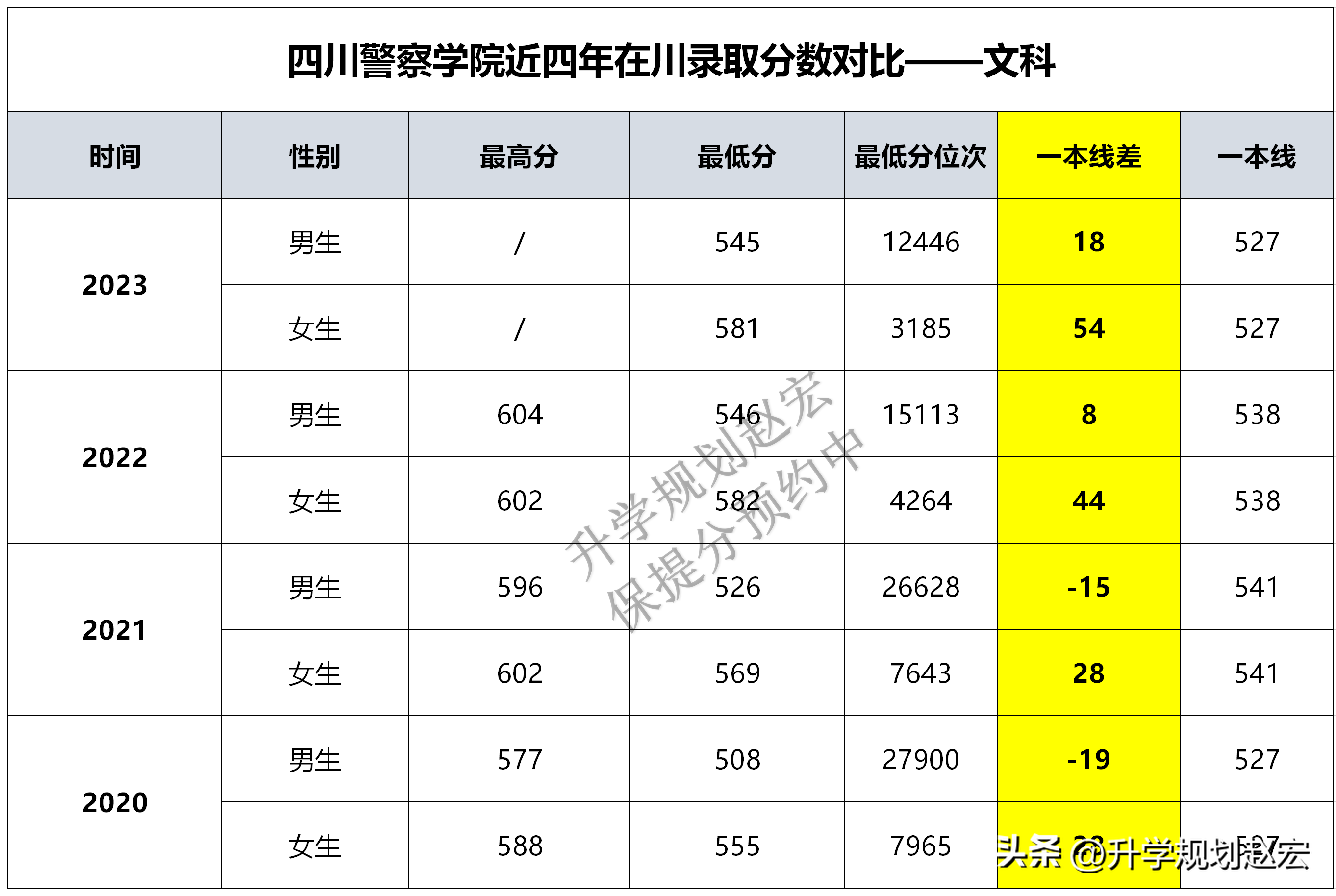 再來看看文科的數據,男生超一本線18分,女生超一本線54分。比2022年增加了10分,對應位次也是好幾千名。這個只是四川警察學院提前批的錄取數據,專科提前批的警犬技術專業,2023年的數據也不簡單。同時咱們看到的也只是調檔線和錄取線而已,據我們所知道的,好多600分的同學也直接報考了川警。比如2022年理科最高分是639分,這個分數是可以報考川大的。今年說不定也會出現類似的情況。