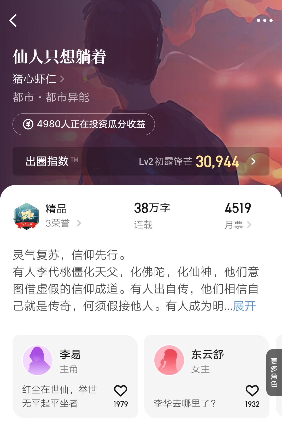 仙人這本小說本月初上架的,當時首訂就成功破萬了,不過小說我還沒怎么看,只記得上架時試讀過一點,不是很感興趣,后續可能會撿起來再看看吧。