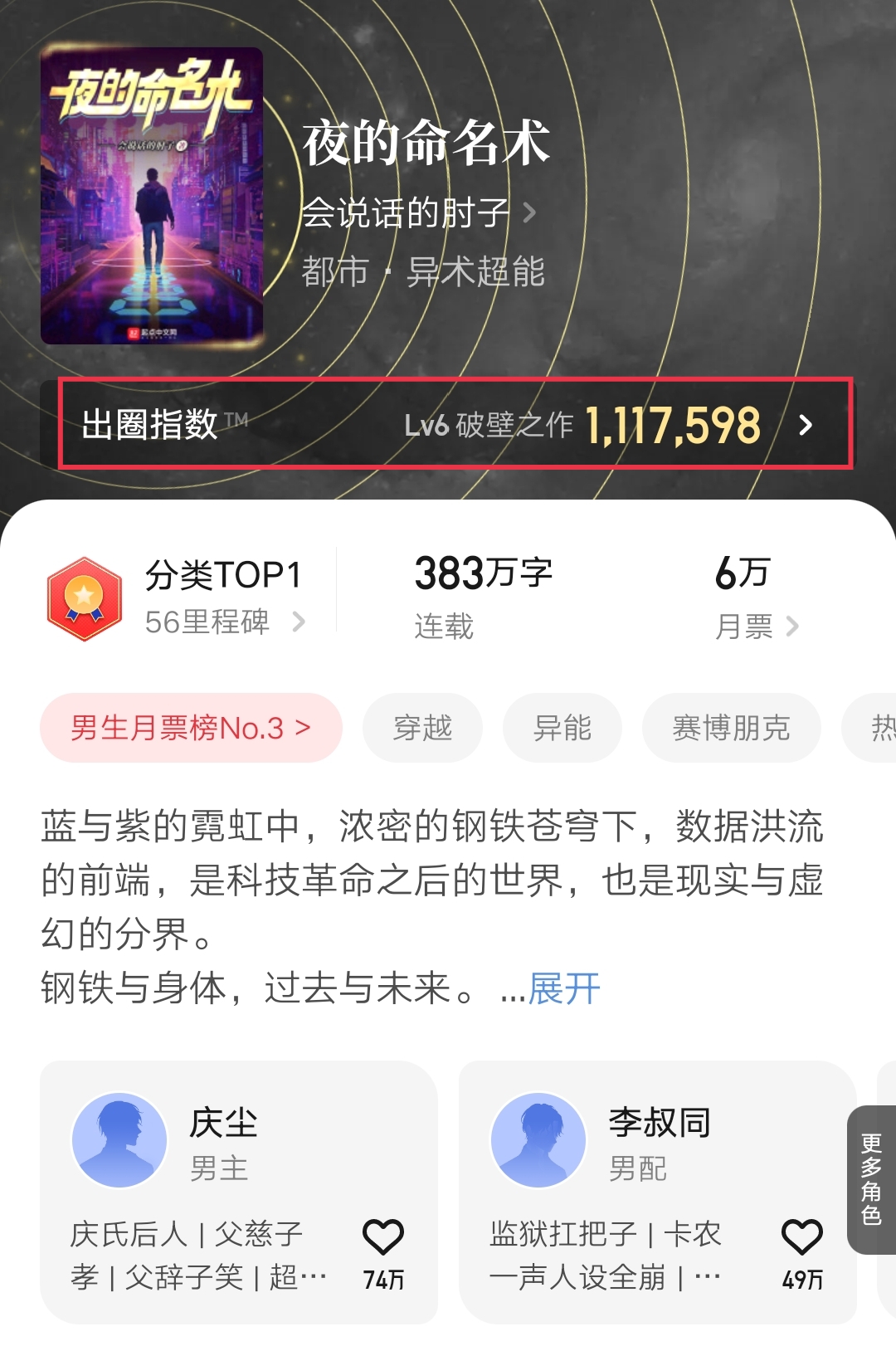 今天看到起點后臺推送了《夜的命名術》出圈指數突破了六級的消息,這是第六部達成這個節點的小說了。