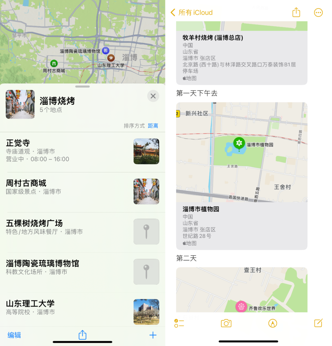 比如想去淄博整一頓小燒烤,如果用第三方地圖,搜索某個地點之后,一般只有目的地詳情、周邊信息以及導航等功能。而在蘋果地圖中,可以點擊“更多→添加到指南”,在這里建立一個目的地合集,將想要光顧的打卡點都收錄進來,隨時都能在合集中查看、編輯,十分方便。