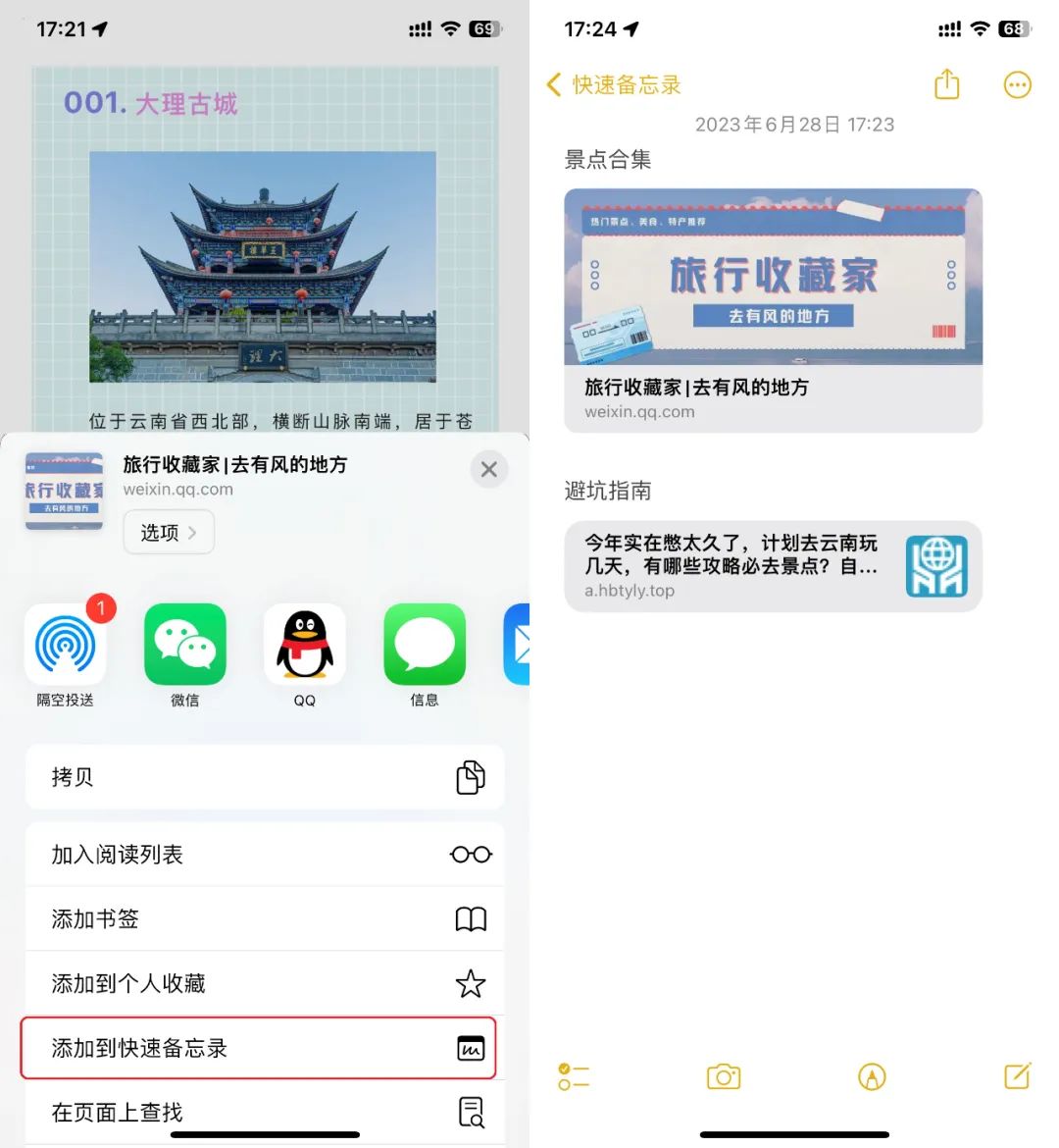 就像剛才提到的“抄作業”,你可以在任何平臺查看網友們分享的旅行攻略,比如在微信公眾號里看到一篇必游景點,在微博里看到網友分享的打卡攻略,又或者在小紅書上看到一篇避坑指南……這時候怎么辦?用備忘錄將它們復制粘貼下來,再慢慢整理?完全不用那么麻煩。