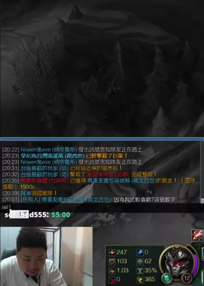 不僅僅是模仿節目和產業,臺灣地區的“直播主”們甚至還借鑒了666這樣的網絡用語。不過,有一個男人成功讓臺灣的直播間“超越”了666,變成了777。他就是臺灣知名英雄聯盟主播“統神”張嘉航。