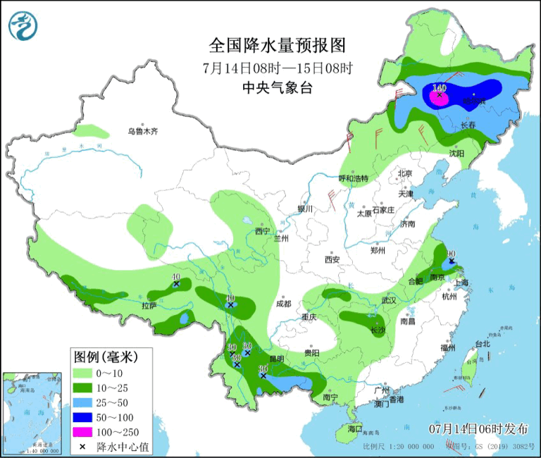 7月14日至15日,內蒙古東部、黑龍江大部、吉林中西部、安徽南部、江蘇中南部、湖南東北部、云南大部、廣西西部、西藏東部和南部等地部分有中到大雨。其中,黑龍江西南部和東部、江蘇南部等地的部分地區有暴雨。