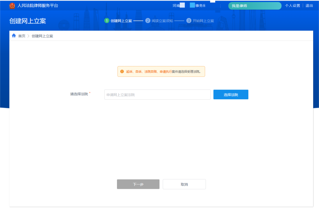 點擊首頁的“網上立案”,選擇法院、案件類型、申請類型,點擊“下一步”,根據提示進行網上立案操作。