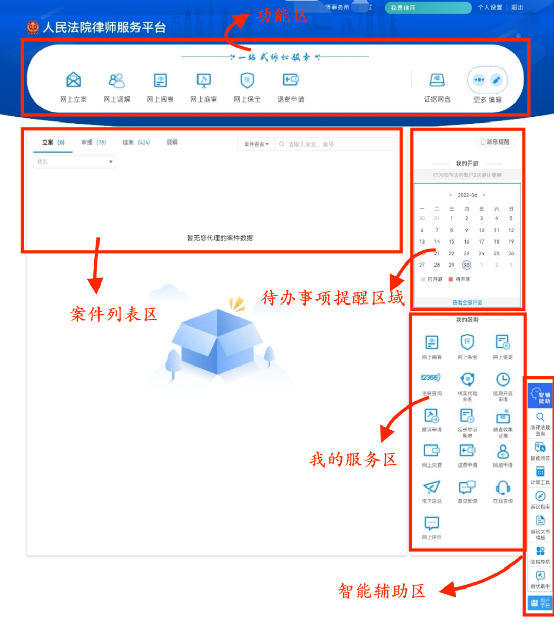 首頁五個區域,分別為功能區、案件列表區、待辦事項提醒區域、我的服務區、智能輔助區。