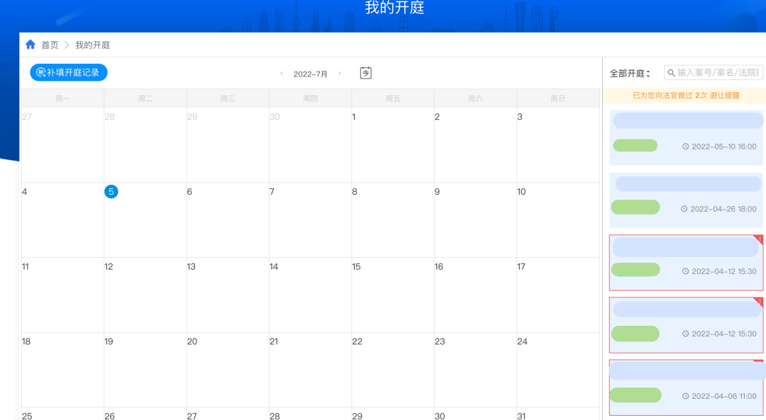 平臺首頁“我的開庭”區域,點“全部開庭”進入“全部開庭”頁面,點擊“補填開庭記錄”填寫開庭信息,完成后,法官開庭排期與該時間沖突時,會給法官開庭排期沖突提醒,平臺會收錄沖突提示的次數。