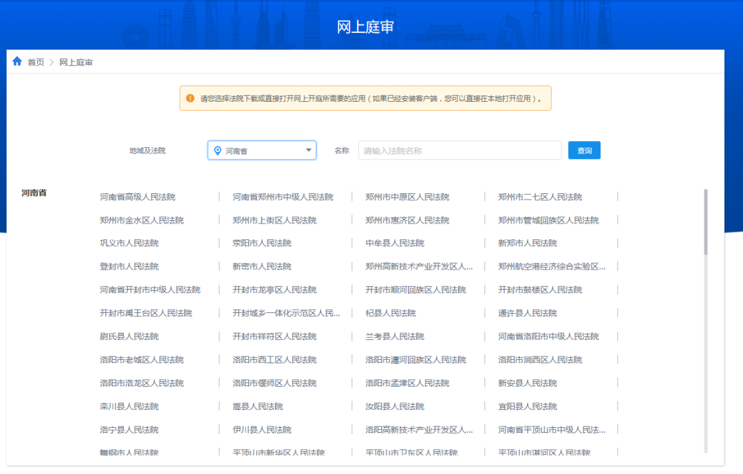 平臺首頁點“網上庭審”,選擇相應法院后,根據需求下載相應的云法庭客戶端,再根據法院提供的賬號登錄云法庭參與庭審。