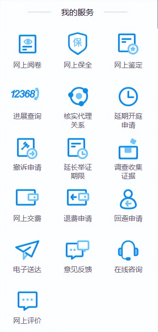 在我的服務區域,可以進行延期開庭、撤訴、延長舉證、調查收集證據、回避申請等事項申請,申請未通過的,可通過進入該申請的詳情頁面查看原因。