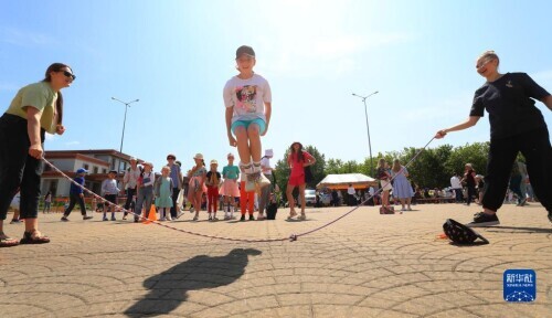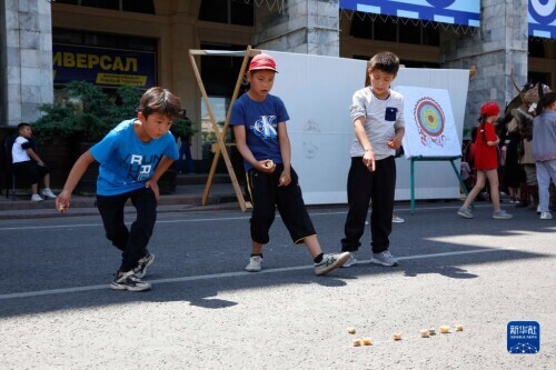 6月1日,孩子們在吉爾吉斯斯坦首都比什凱克阿拉套廣場做游戲,慶祝“六一”國際兒童節。