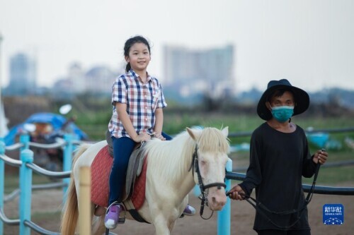 6月1日,一名兒童在老撾首都萬象湄公河邊學騎馬,慶祝“六一”國際兒童節。