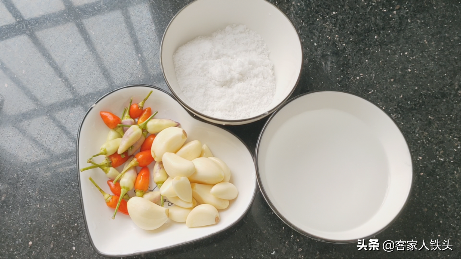 食材準備:豆角4斤,150克食用鹽,1小把朝天椒,一個大蒜頭,半碗40度的米酒,涼白開適量等。