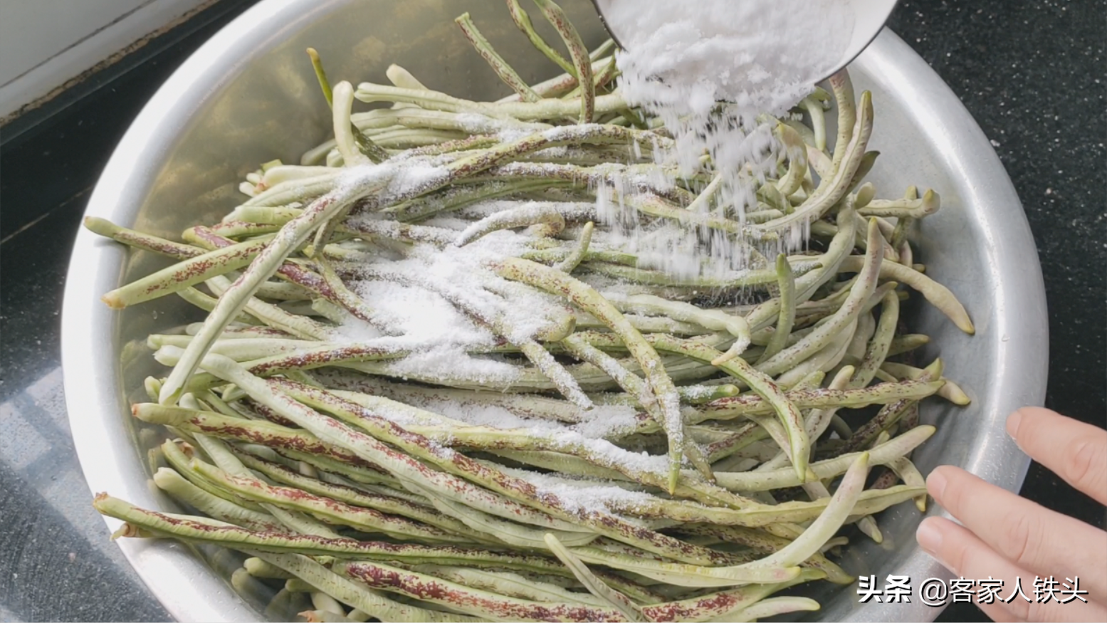 第一步:準備長豆角4斤,這時候我們這里只有這種花豆角了,媽媽說這是八月角,開花結果很多,每年種一兩排吃都吃不完,只能摘來腌制或曬干了,豆角摘回來清洗干凈后晾干水分,然后加70克左右的食用鹽進去抓拌均勻,抓拌至豆角軟化后放一邊靜置一個小時左右。