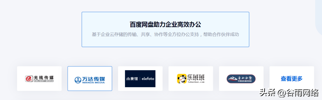 當下百度網盤企業版已經合作了數百萬家企業了,比如萬達傳媒、光線傳媒、小象館、MBA智庫、龍江旅投等。