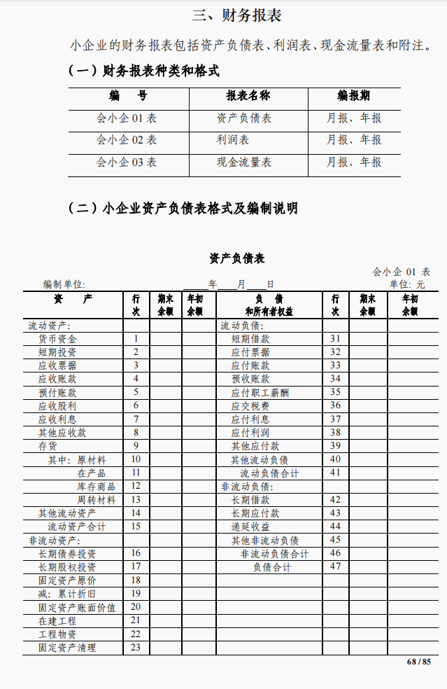三、小企業會計準則財務報表格式和填寫說明