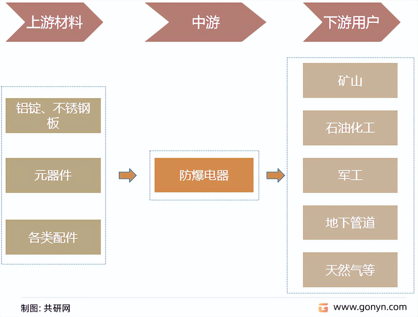 防爆電器的上游行業可以分為鋁錠、不銹鋼板等金屬冶煉行業以及元器件、各類配件行業。下游主要應用在礦山,石油化工、軍工、地下管道等行業。