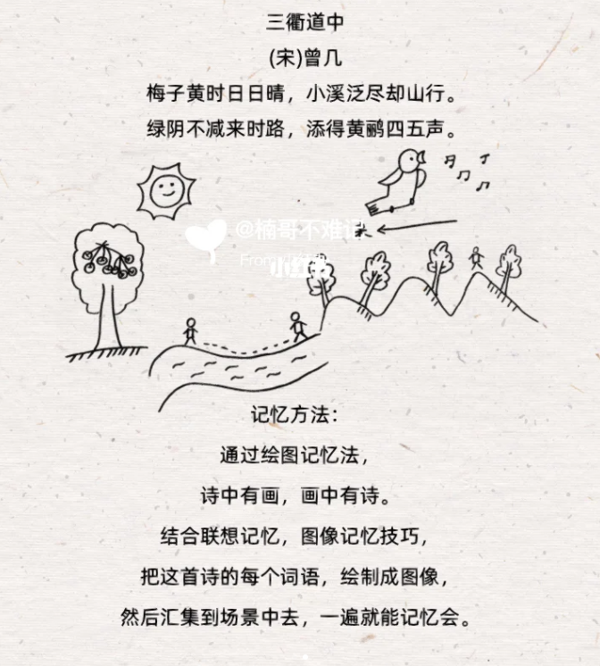 導讀每日快速記憶一首古詩詞—《三衢道中》?今日古詩背誦?《三衢道中》曾幾梅子黃時日日晴,小溪泛盡卻山行。綠陰不減來時路,添得黃鸝四五聲。記憶方法通過繪圖記憶法,詩中有畫,畫中有詩。結合聯想記憶,圖