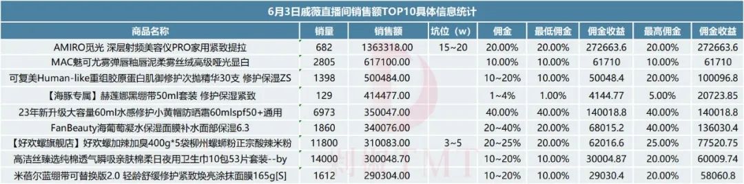 根據一些業內人士的實際反饋,以戚薇直播間賣的最好的6月3日為例,剁主統計銷售額前十名,除去運營成本、話費補貼(聯通、移動、電信)、投流成本,戚薇能賺得400多萬。尤其是美妝品類,基本都是高貨值、高利潤的品。