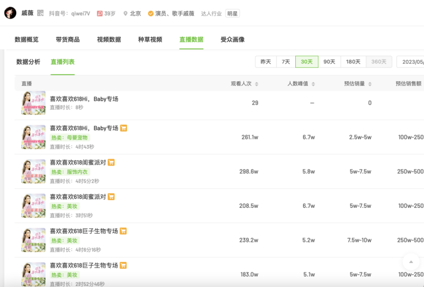 如今,同樣在美妝垂類屬于頭部主播的“東方甄選美麗生活”,整個抖音618銷售額高達2.5億-5億元,戚薇2800萬元的GMV量級遠遠比不上。不少行業人士的體感,“戚薇現在的帶貨能力確實沒有以前強了”。換句話說,華夏視聽選擇戚薇的時機不對,現在并不是她直播變現能力最強和最為高光的時刻。